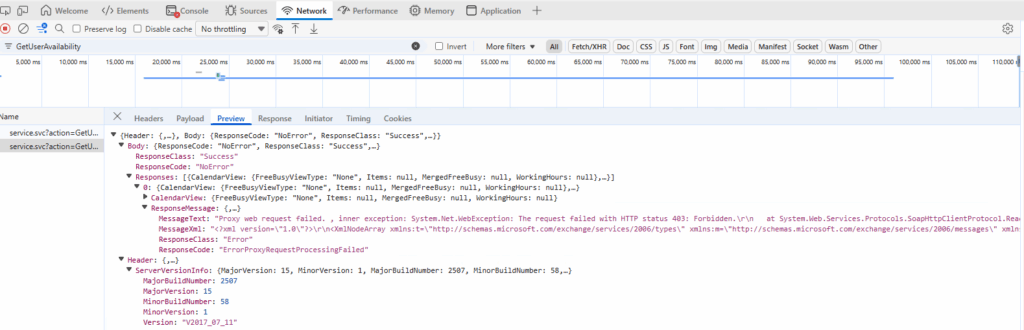 Getting output like this when attempting a test command, the user testuser@domain.com being the local on-premise email mailbox attempting to access free/busy of a calendar in a cloud user’s mailbox.