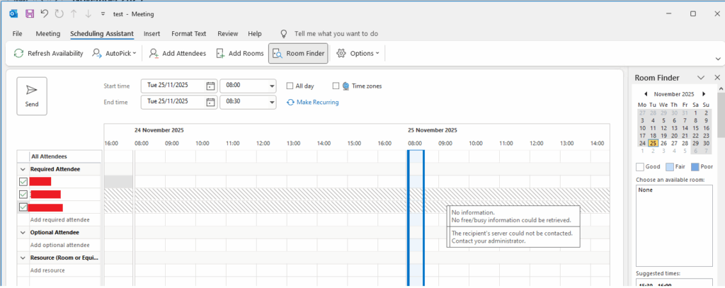 Free/Busy information does not show for on-premise user mailboxes when accessing a cloud mailbox’s calendar, where that cloud mailbox calendar is shared only with AvailabilityOnly or LimitedDetails permissions – i.e. just Free/Busy. It is worth noting that even when provided with Reviewer and/or Editor permissions to the calendar of a cloud mailbox which allows the calendar to be viewed successfully (in Microsoft Outlook (Windows) only), some parts of Outlook/OWA still use Free/Busy information (e.g. Availability Finder) and ignore the extra permissions which still appears to show an issue; additional AppleOS clients using Microsoft Outlook for Mac, which rely on EWS (Exchange Web Services) which is what Outlook Web Access (on-premise) also uses this EWS method, so are also affected.