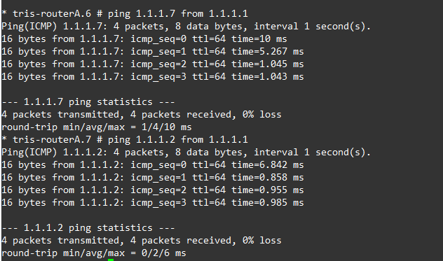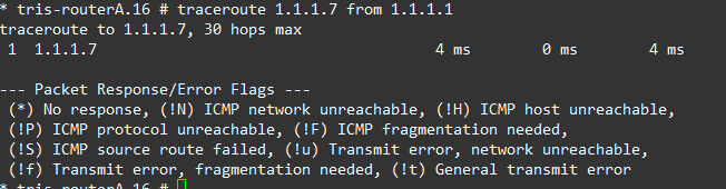 If we down the link between Router A and Router G, then attempt to ping/traceroute from Router A’s Loopback IP (1.1.1.1) to Router G’s Loopback IP (1.1.1.7), we can observe that connectivity is maintained and the route changes accordingly based on what OSPF is advertising.