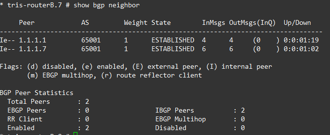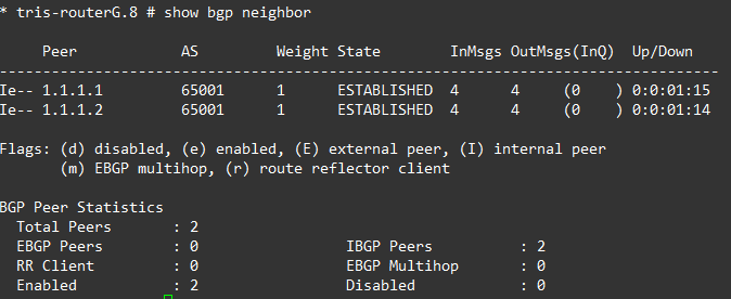 If we examine each router’s BGP Neighbours, everything is established and showing as iBGP peers as we’d expect.