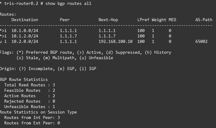 The issue we were seeing on Router B and G was they were never installing the route for 10.2.0.0/24 (from Router C), hence it was showing as “unfeasible”, because they had no route to the “next-hop”, i.e. the Router A to Router C point to point network (192.168.100.8/30).