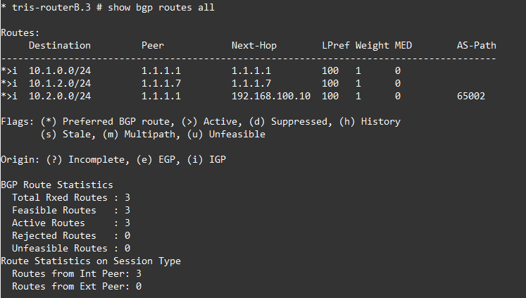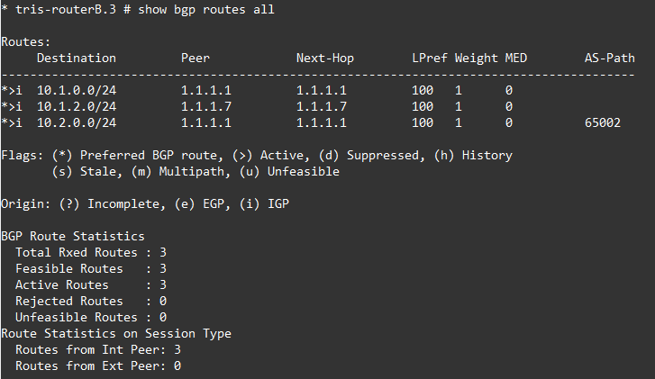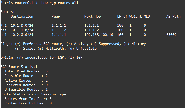 Now we can move onto examining the actual routes. So let’s do that, below are the three BGP Routes for Router A, Router B and Router G.