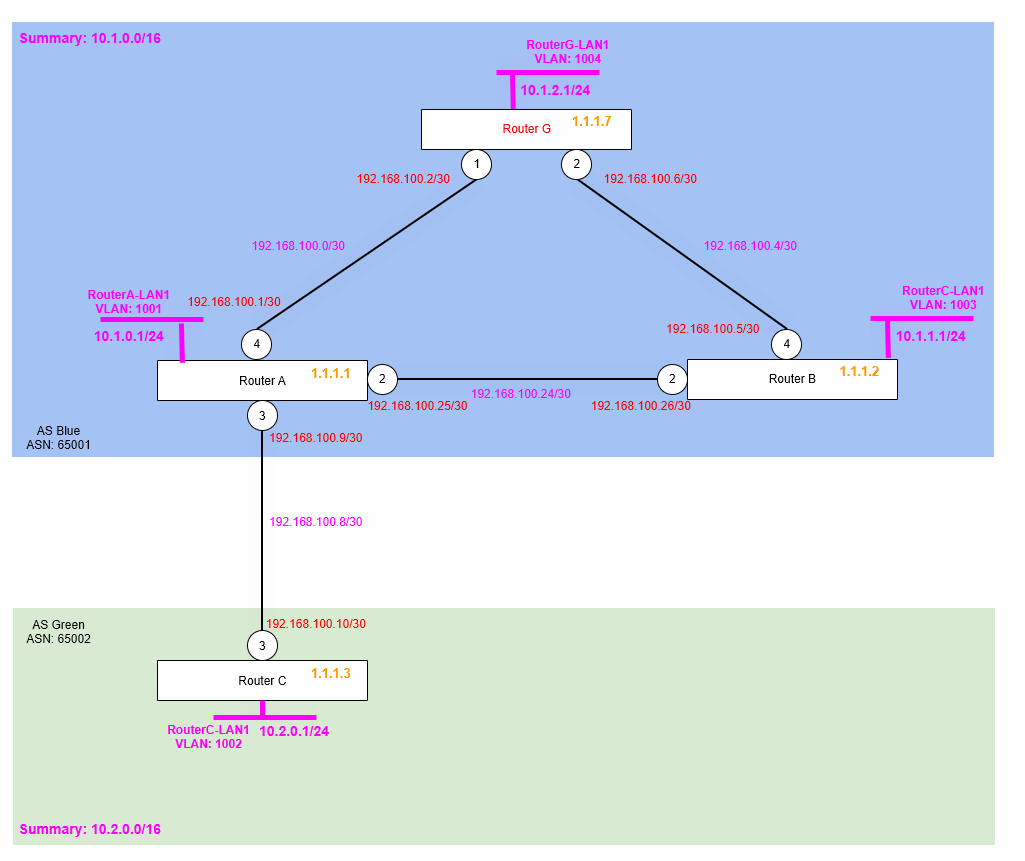 So, Router G’s RouterG-LAN1 (10.1.2.0/24) network should be able to reach the LANs that are routed on Router A, B and C, i.e. RouterA-LAN1, RouterB-LAN1 and also RouterC-LAN1, and vice versa.