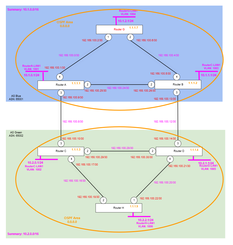As you can see in our topology, we have added two new Routers, Router D and Router H (both in AS Green), we’ve also added another link between AS Blue and AS Green. With this topology we’ll now be able to explore multiple exit points and other techniques for manipulating the traffic flow between two points on the network.