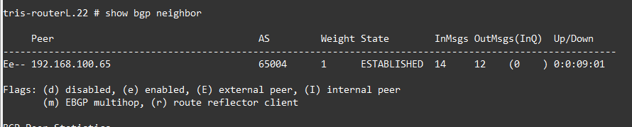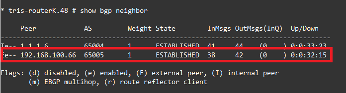 Now we examine the output of: show bgp neighbor 192.168.100.65, and we can see indeed that the Hold Timer and Keep alive Timers have been changed to 45 and 15 seconds respectively. We see this on both Router L and on Router K, because it is negotiated to the lowest value, i.e. it uses whichever value is configured lowest.