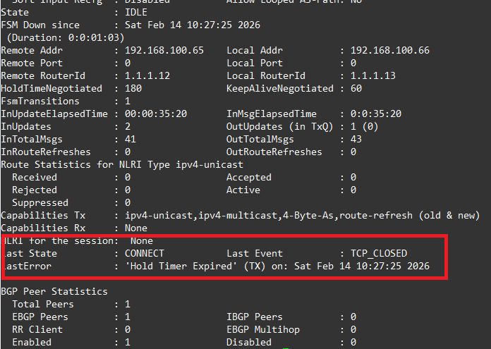 But after 180 seconds, we then see when running show bgp neighbour 192.168.100.66, the detail where we can see it’s finally detected the BGP neighbour has gone and then removes it from the Route Table, as we can see its showing the reason as “Hold Timer Expired”.