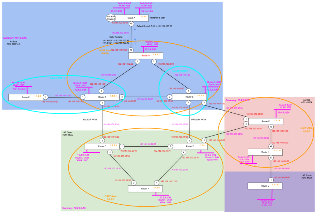We’re making some additional changes to the topology, we are adding two new routers, Router K and Router L, where Router K is added within AS Red (65003), but Router L is added into its own AS, called AS Purple (65004). These are slightly newer hardware so will give some options for later on in the series, but for now we’re just adding them so we have some additional routers tweak some settings on and see what happens!