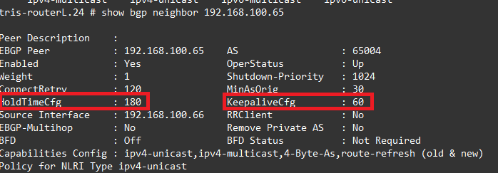 configure bgp neighbor 192.168.100.65 timer keep-alive 15 hold-time 45