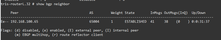 There is functionality called by Cisco “fast external failover”, the same functionality exists in Extreme Networks XOS. This functionality means that the BGP Neighbour state is pinned to the interface state, meaning in our example above, the BGP neighbour (peer) would have immediately swapped to INIT state when the interface went down, rather than having to wait for the Hold Timer to expire.